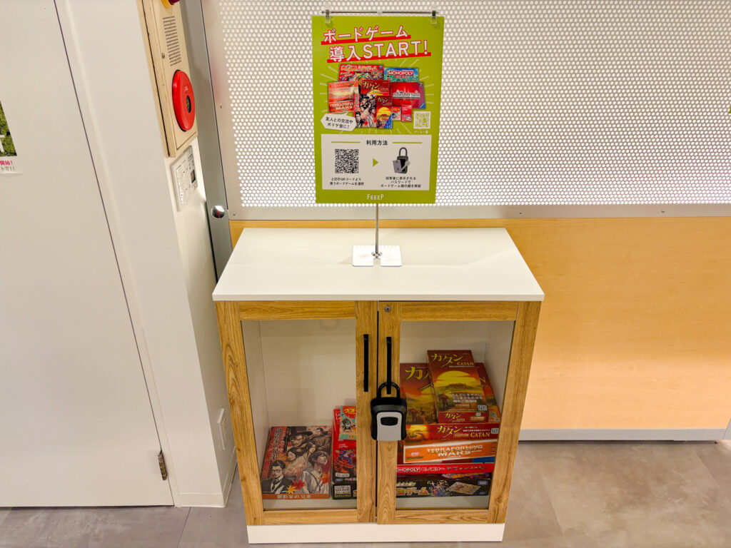 5.鍵で棚を解錠して使いたいボードゲームを取り出してください。 ボードゲームを取り出した後、棚の鍵を閉めてキーボックスに鍵を戻してください。