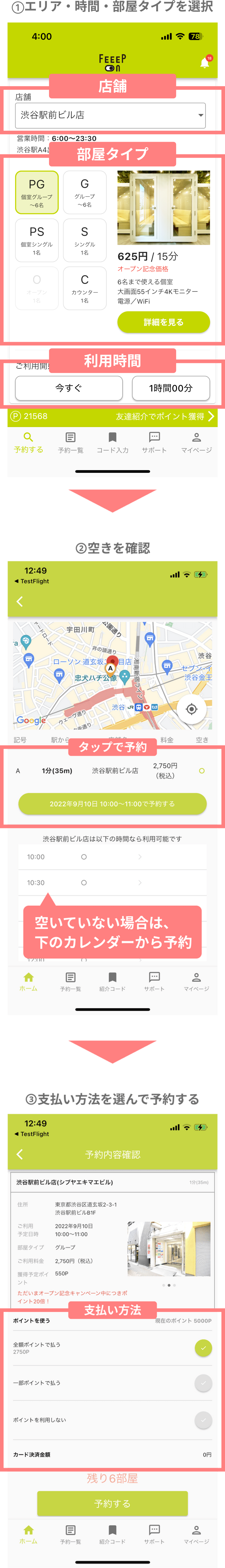 FEEEPは、アプリで30秒で予約できる「はかどり空間」です。