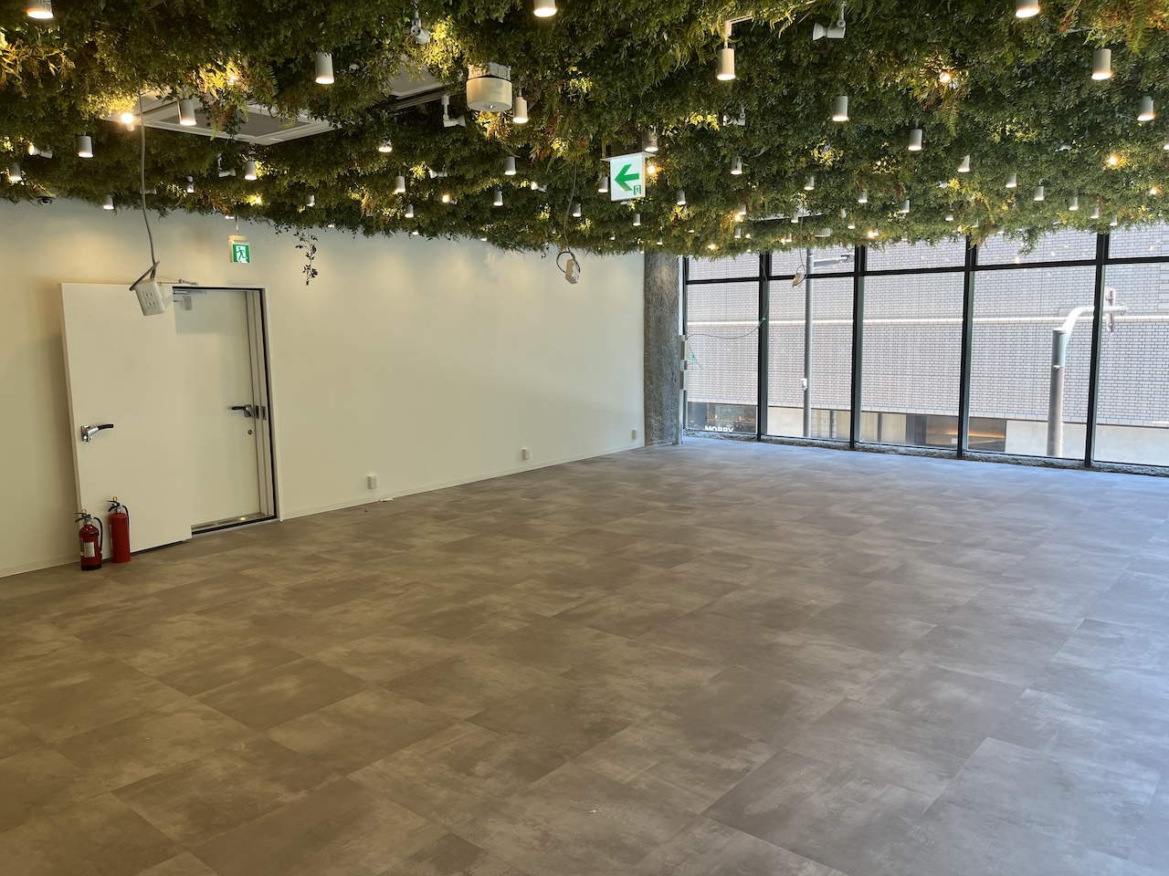 ガラス張りの外観と、グリーンの天井・石目調の床が印象的な洗練空間は、
