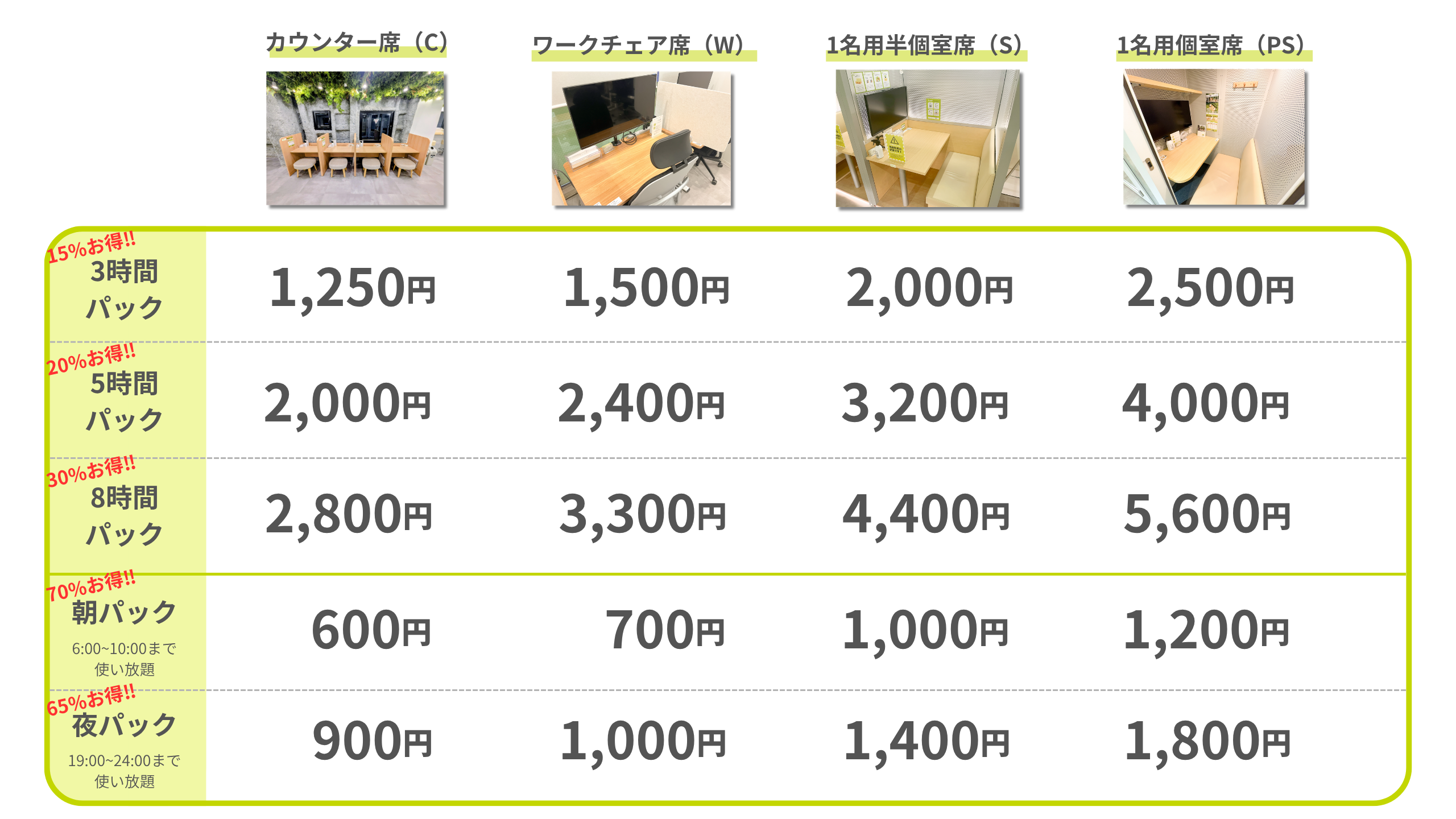 「半日集中したい」「夕方までしっかり作業したい」といった実際の利用シーンに合わせ、より刻みの細かいプランを選択いただけるようになります。
