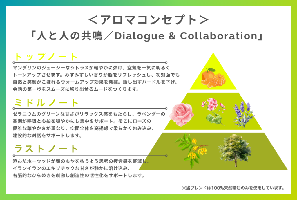 このたび、 FEEEP(運営:株式会社FEEEP)はミッションである「出会いの可能性を広げる」をコンセプトに、新アロマ “Dialogue & Collaboration” をオリジナル開発し全店舗へ導入しました。時間とともに変化する香りのレイヤーがリラックスから創造性まで、深い対話や生産性向上を自然に後押しします。