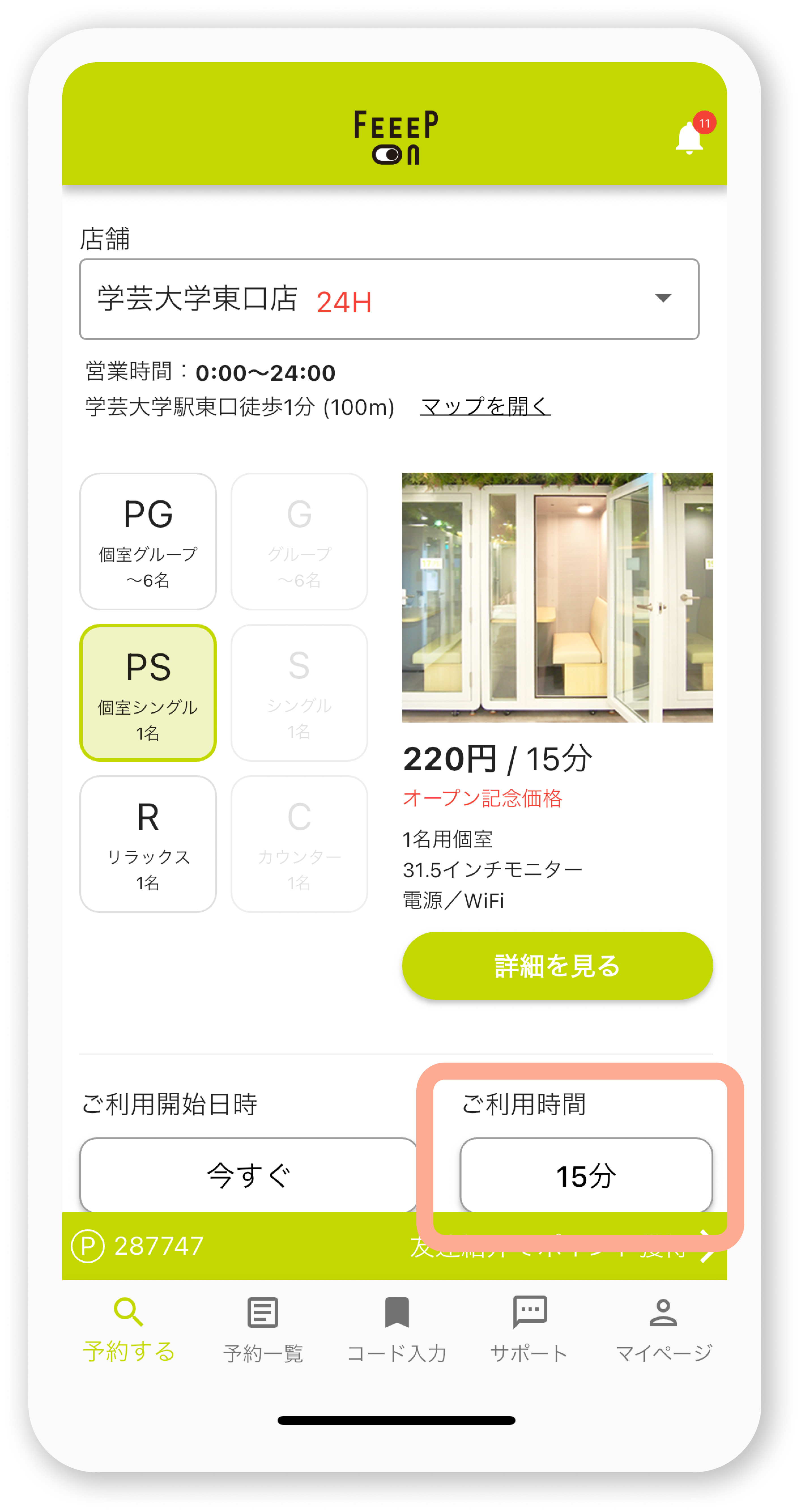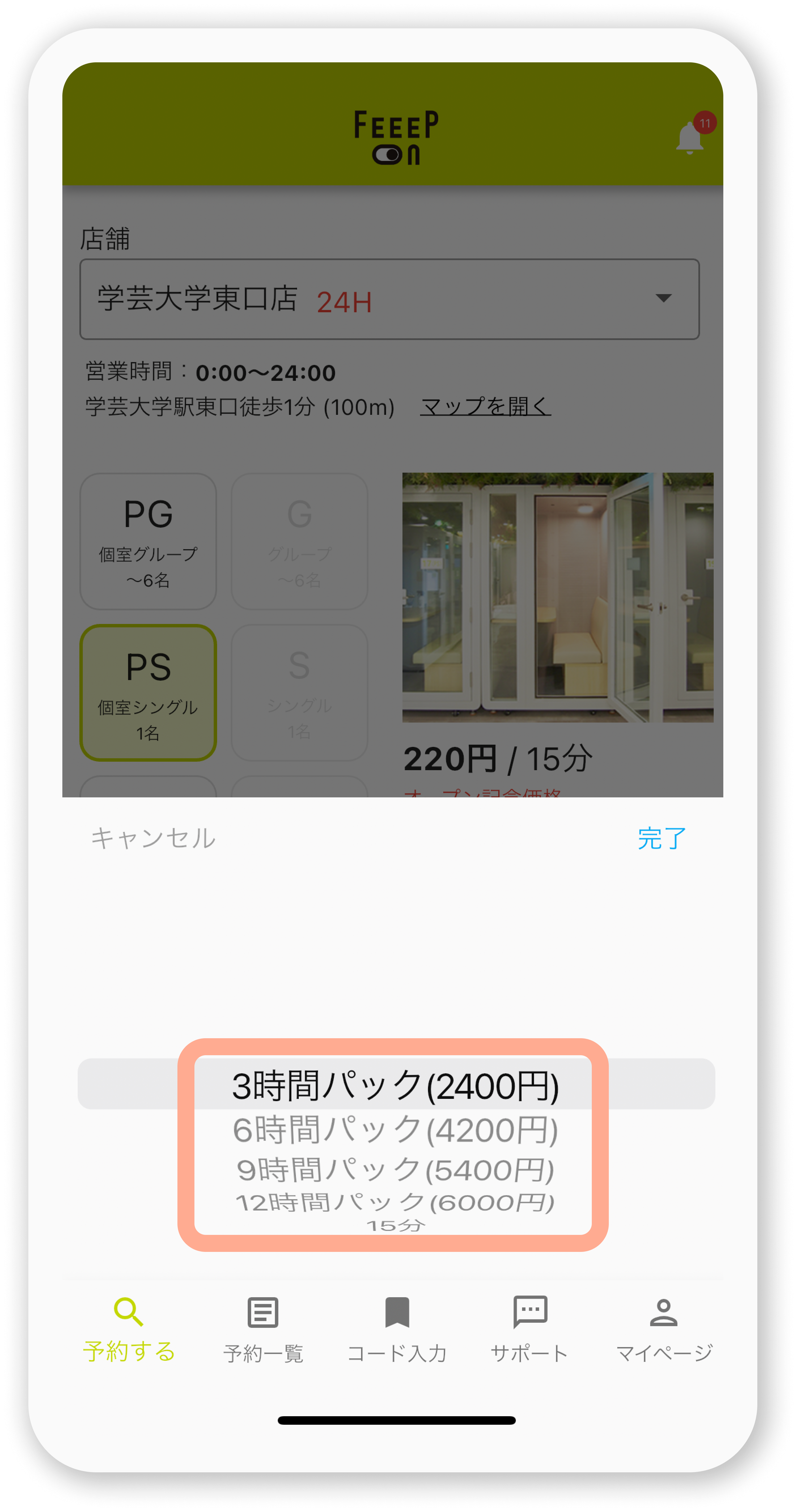 ①店舗・座席・利用開始日時を設定後、ご利用時間の箇所をタップ