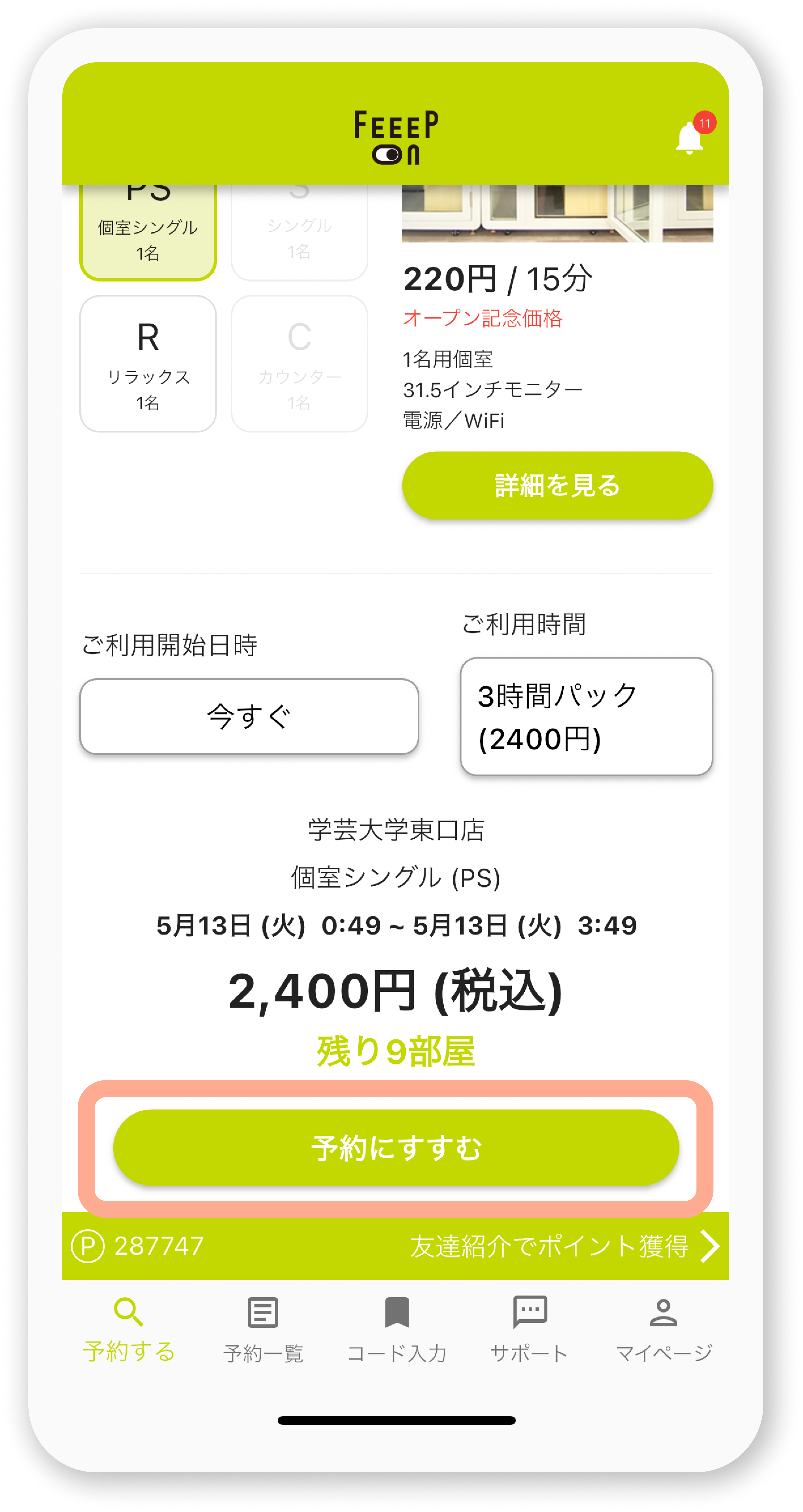 ③画面を下にスクロールして「予約にすすむ」ボタンを選択