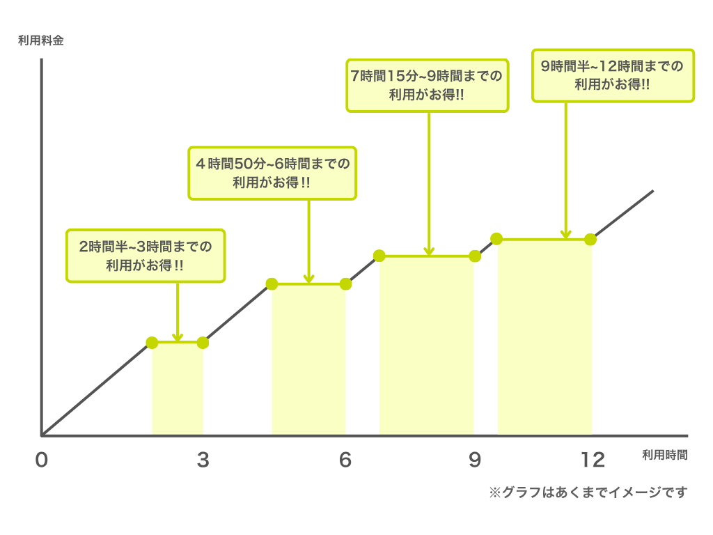 3時間パックは通常価格の20%引き、6時間パックは通常価格の30%引き、9時間パックは通常価格の40%引き、12時間パックは通常価格の50%引きで提供しております。