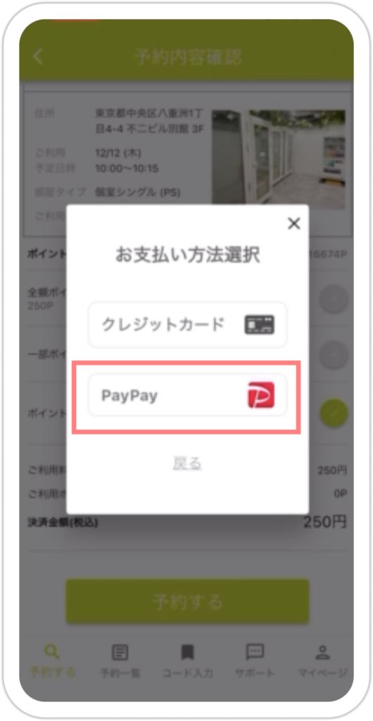いつも通り、利用店舗・利用座席・利用時間を選択後お支払いに進むと、自動的に支払い方法を選択する画面が表示され、「PayPay」を選択するとPayPay決済が利用できます。