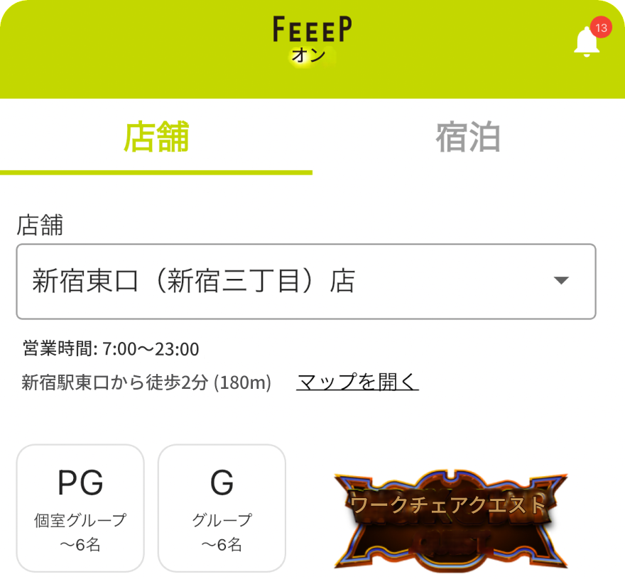 画面一番上の店舗選択画面で「新宿東口店」を選択